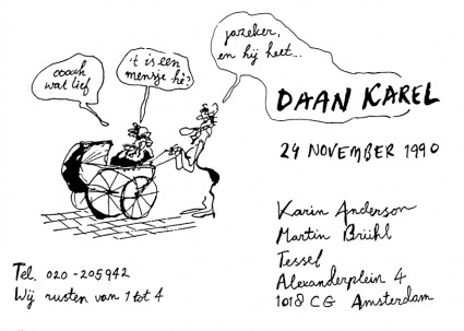 Eigenlijk was je uitgerekend op 23 november, de verjaardag van je opa Karel George Brühl (23-11-1920 tot 04-07-1977). Op de verjaardag van opa Karel gingen alle kinderen, Flip, Hermine, Martin, Karel en Lucas altijd met oma Annelies uit eten. Ook deze 23e. Martin zei dat hij het niet laat zou maken, maar was pas om kwart voor een op de 24e thuis. Hij lag nog niet in bed, of: kabam, daar kwam een wee. En vrij snel daarna nog een en vervolgens regelmatig, om de 3-5 minuten. We belden de vroedvrouw, Miriam Konijn, die kwam meteen en zei dat ik al 6 cm. ontsluiting had. Martin mocht meteen aan de slag om alles klaar te zetten. Bij de laatste perswee zegt de Miriam nog: 'even niet persen, maar zuchten' maar toen was het al te laat. Ik moest in het ziekenhuis gehecht worden.